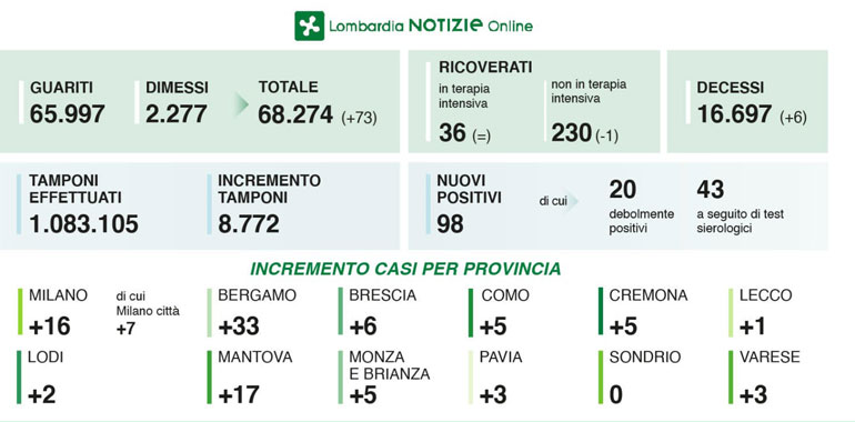 Cinque nuovi tamponi positivi nelle ultime 24 ore in provincia di Cremona. Nelle province limitrofe, nel milanese sono stati conteggiati 16 casi, di cui 7 a Milano città, Bergamo 33, Brescia 6, Como 5, Lecco 1, Lodi 2, Mantova 17, Monza e Brianza 5, Pavia 3, Sondrio 0, Varese 3. I nuovi casi positivi in tutta la Regione sono 98, di cui 20 debolmente positivi e 43 a seguito di test sierologici. I decessi registrati sono 6, per un totale complessivo di 16.697. In Regione il numero dei ricoverati in terapia intensiva è stabile a 36, mentre i ricoveri non in terapia intensiva scendono di una unità, attestandosi a 230.