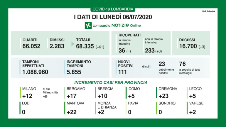 L’incremento cremonese è il più alto in Lombardia, davanti a Mantova (22) e Bergamo (17), mentre a Lodi, Pavia e Sondrio non hanno fatto registrare nuovi contagi. Crescono anche i ricoverati (+3, totale 233), mentre rimangono stabili quelli in terapia intensiva (36). In aumento anche i guariti e dimessi (+61, totale 68.335, di cui 66.052 guariti e 2.283 dimessi), mentre si registrano anche 3 nuovi decessi, portando il totale delle vittime da Covid a 16.700.