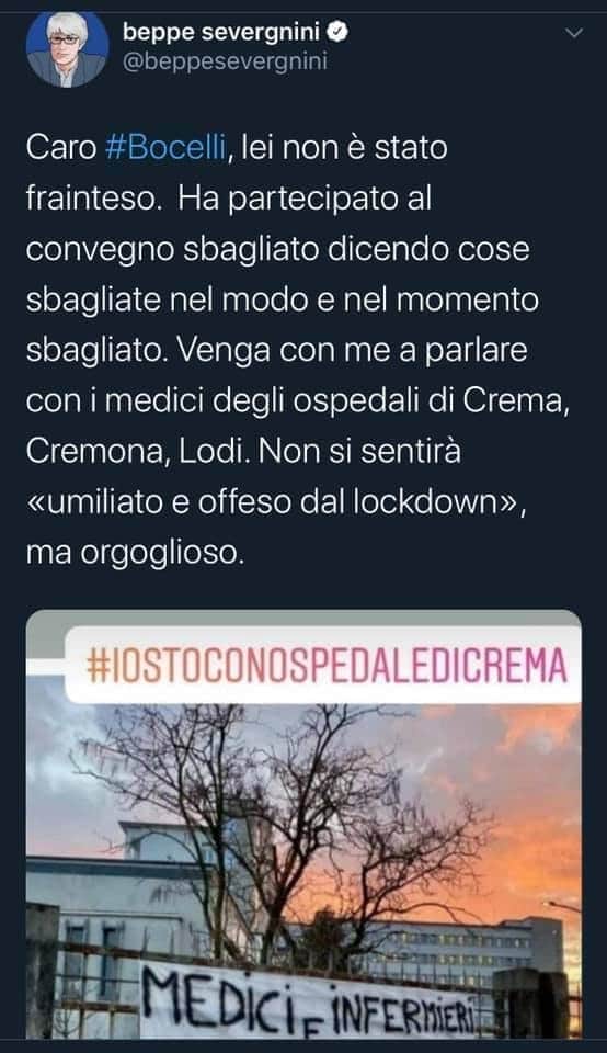 Ma Severgnini non ci sta, e sul proprio profilo Twitter posta una foto dell’ospedale di Crema, con lo striscione che era stato appeso durante il lockdown a sostegno del personale sanitario: “Caro Bocelli, lei non è stato frainteso. Ha partecipato al convegno sbagliato dicendo cose sbagliate nel modo e nel momento sbagliato. Venga con me a parlare con i medici degli ospedali di Crema, Cremona, Lodi. Non si sentirà ‘umiliato e offeso dal lockdown’, ma orgoglioso”.