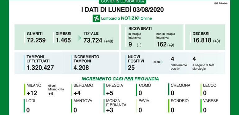 Cremona torna a zero il numero di nuovi positivi al Coronavirus sul territorio cremonese, mentre a livello regi0onale i nuovi contagi sono 25. Otre a Cremona si registrano zero contagi anche a Como. Lecco, Lodi, Mantova, Pavia, Sondrio e Varese. Del resto piuttosto basso anche il numero di tamponi effettuati nelle ultime 24 ore: 4.208. I guariti dimessi sono ormai 73.724 in tutto (+48), mentre rimangono 9 le persone in terapia intensiva. Cresce invece il numero dei ricoverati in altri reparti: risalgono infatti a 162 (+9). Le vittime sono state 3 in tutta la Lombardia, complessivamente 16.818.
