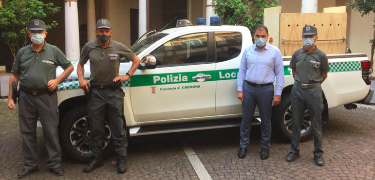 Alla presentazione del mezzo il presidente della Provincia di Cremona, Paolo Mirko Signoroni con il Comandante della Polizia Locale Provinciale Massimo Pegorini ed il Vice Marco Sperzaga insieme con l’agente Aldo Maffezzoni.