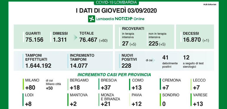 Sono 228 i nuovi positivi al Coronavirus riscontrati in Lombardia nelle ultime 24 ore (di cui 41 ‘debolmente positivi’ e 12 a seguito di test sierologico), e 7 nella provincia di Cremona, a fronte di 14.077 tamponi effettuati