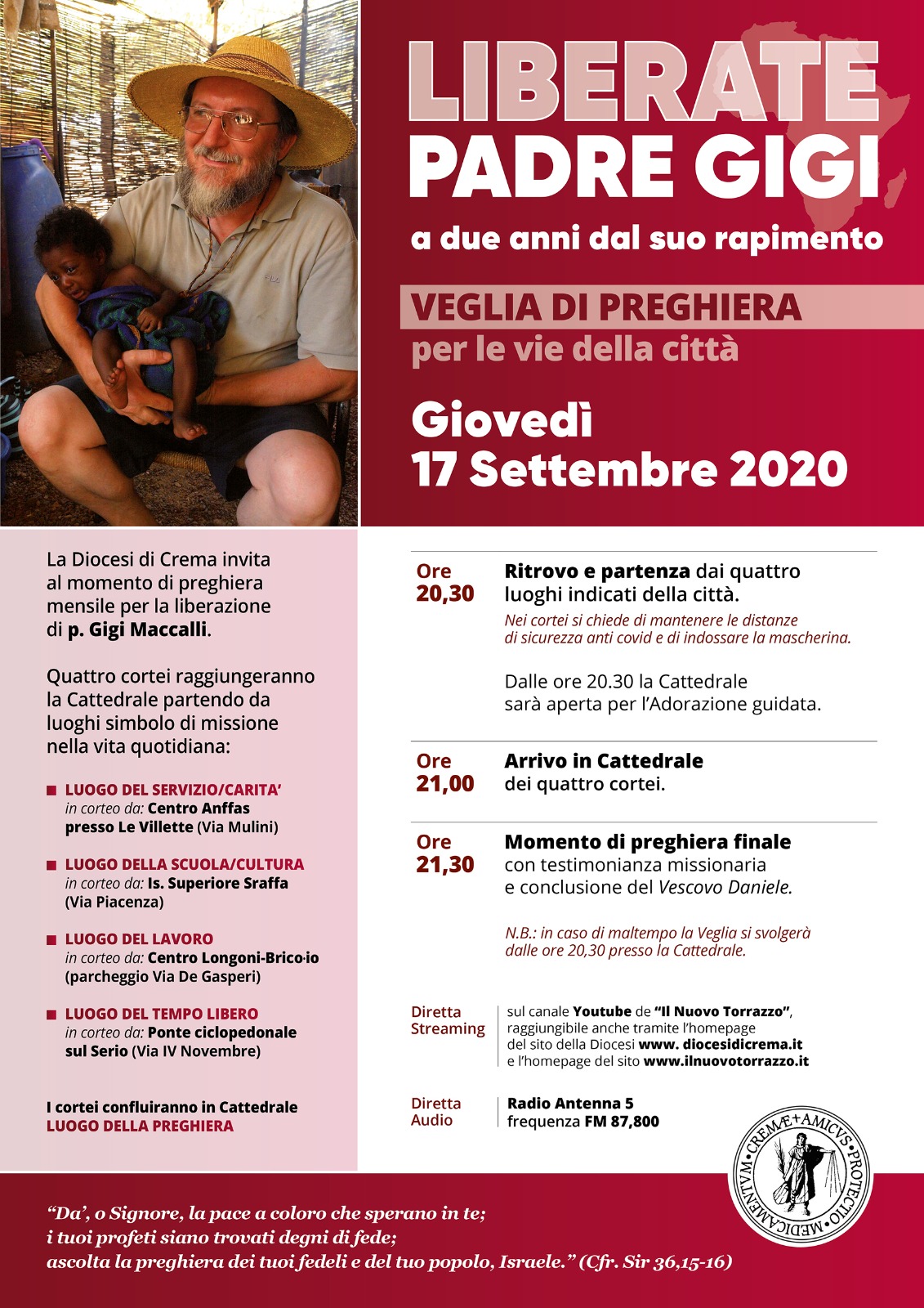 La speranza e la fede sono gli appigli a cui la famiglia, gli amici e i confratelli di padre Gigi si sono aggrappati in questi due anni di angoscia. Per 24 mesi, ogni 17, le parrocchie della Diocesi di Crema si sono date il cambio in una staffetta di veglie, pregando di poter riabbracciare Gigi sano e salvo.