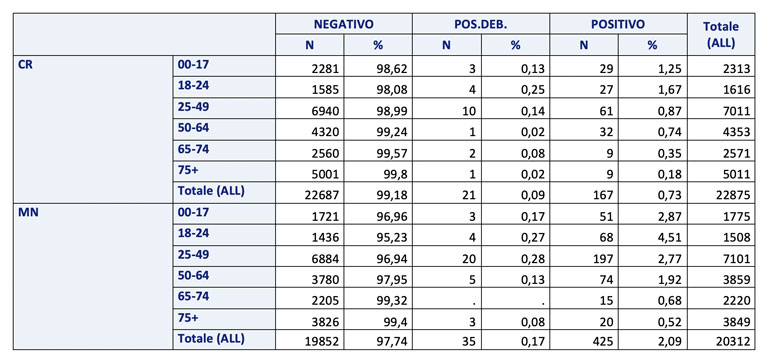 I dati sono stati resi noti dal’Ats della Val Padana, che ha comunicato anche i risultati relativi ai test sierologici rapidi per la ricerca di anticorpi specifici (IgM e IgG) nei confronti del virus SARS-CoV-2, dedicati al personale scolastico docente e non docente e di quello dei servizi educativi per la prima infanzia, eseguiti a partire dal 24 agosto. In particolare sono 3986 i test effettuati tra Cremona e Crema, di cui 277 positivi (80 a Crema e 197 a Cremona) e 26 dubbi.