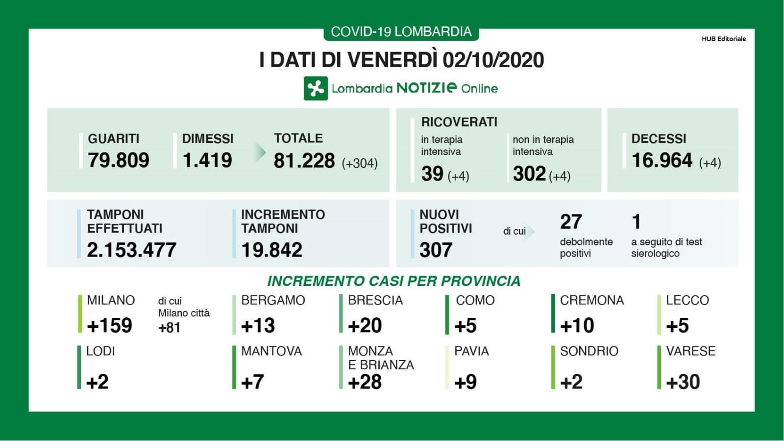 I nuovi casi positivi in tutta la Lombardia sono 307, di cui 27 debolmente positivi e 1 a seguito di test sierologici. Sempre in Regione il numero dei ricoverati in terapia intensiva sale di 4 unità e va a quota 39, così come i ricoveri non in terapia intensiva che arrivano dunque a 302. Quattro i decessi in Lombardia.