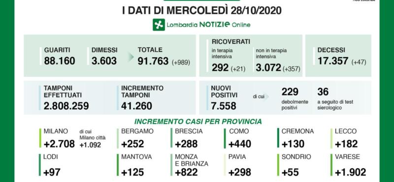 A livello regionale, sono 7.558 i casi registrati nelle ultime 24 ore, di cui 229 debolmente positivi e 36 a seguito di test sierologico per un totale di 41.260 tamponi. In terapia intensiva ci sono 21 ricoverati in più (il dato totale è di 292), mentre non in terapia intensiva l’aumento è di 357 (totale 3.072). 47 i decessi. In provincia di Cremona si sono registrati 130 nuovi casi, due in più di ieri. Nelle altre province, Milano è sempre la più colpita con 2.708 nuovi casi, di cui 1.092 nella sola città; Bergamo 252, Brescia 288, Como 440, Lecco 182, Lodi 97, Mantova 125, Monza e Brianza 822, Pavia 298, Sondrio 55, Varese 1.902.