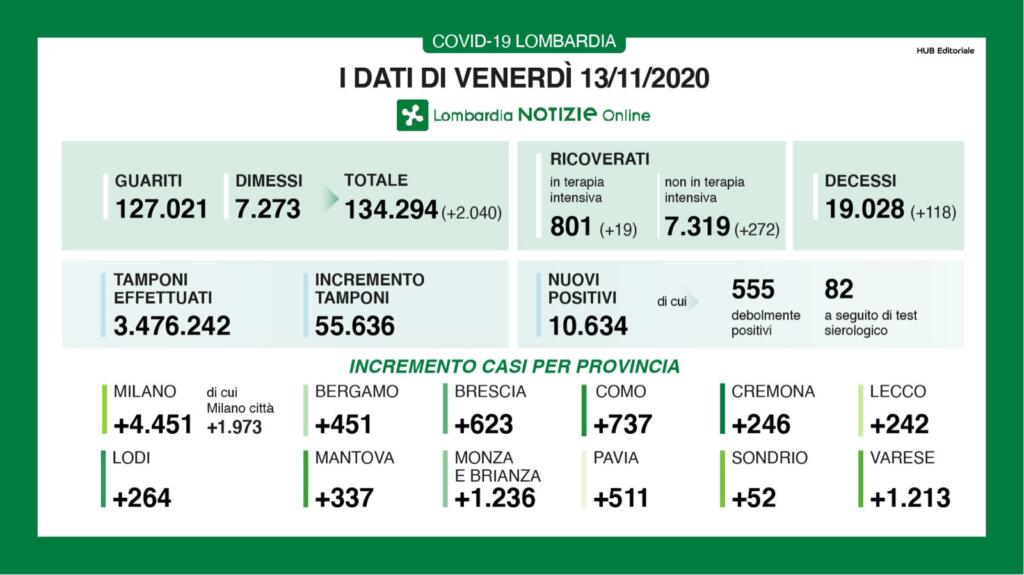 Per quanto riguarda le province lombarde, nello specifico sono 4.451 i nuovi contagi registrati in provincia di Milano. Sono 1.236 i nuovi positivi nella provincia di Monza e Brianza, 1.231 in quella di Varese, 623 in provincia di Brescia, 737 in quella di Como e 511 a Pavia. La provincia di Bergamo ha registrato 451 nuovi contagi, mentre sono 242 quelli a Lecco, 264 nella provincia di Lodi, 52 nella provincia di Sondrio e infine 337 a Mantova.