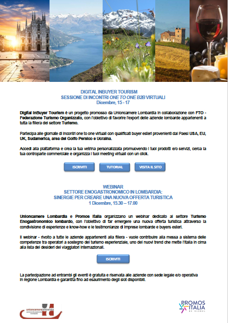 Infine, dal 15 al 17 dicembre, è previsto il Digital InBuyer Tourism, un B2B, con tour operator provenienti da Europa, Gran Bretagna, Stati Uniti, Sud America, Golfo Persico e Ucraina, in collaborazione con FTO-Federazione Turismo Organizzato, con l‘obiettivo “di favorire l’export delle aziende locali appartenenti a tutta la filiera del settore del Turismo. Anche la partecipazione al B2B è gratuita ed è riservata alle aziende con sede legale e/o operativa in regione Lombardia e garantita fino ad esaurimento degli slot disponibili”.