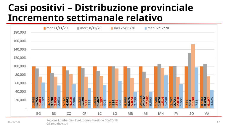 La percentuale dei casi positivi sul numero di tamponi efficaci (positivi + negativi) scende al 28% e anche la percentuale di tamponi positivi per le persone «nuove» sottoposte al test si riduce al 34%. “Anche se in calo, questi valori sono comunque molto alti: la situazione è ancora praticamente fuori controllo e non si riescono ad effettuare tutti i tamponi che sarebbero necessari per un corretto controllo del contagio sul territorio” evidenzia Astuti. Conforta però il calo dei ricoverati, (sia in terapia intensiva che non), che inizia a diminuire rispetto alle settimane precedenti.