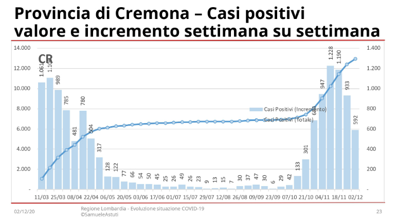 In provincia di Cremona i contagi da Covid sono dimezzati rispetto a un mese fa: questo emerge dal report settimanale stilato dal consigliere regionale Pd, Samuele Astuti, secondo cui a fronte dei 1.228 casi registrati nella settimana fino all’11 novembre, siamo passati ai 592 registrati nell’ultima settimana (da mercoledì 25 novembre a mercoledì 2 dicembre).