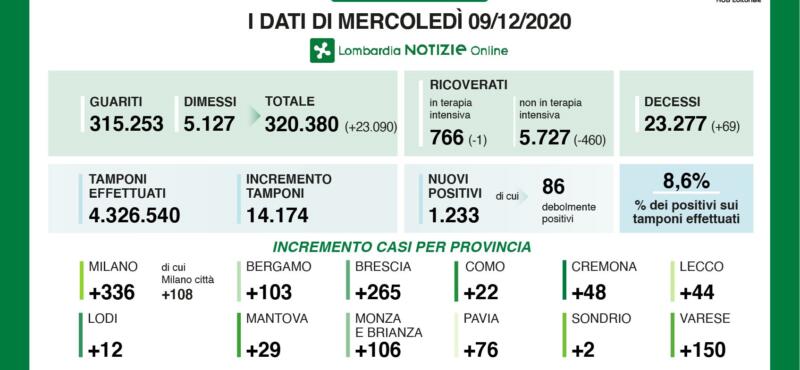 E’ di 48, rispetto ai 45 di ieri, il numero dei nuovi positivi al coronavirus nelle ultime 24 ore in provincia di Cremona. Scende ancora il numero dei tamponi: 14.174 contro i 16.276 di ieri per una percentuale di 8,6%. 1.233 i nuovi casi in Lombardia, di cui 86 debolmente positivi. Scendono di una unità i ricoveri in terapia intensiva per un totale di 766, mentre scendono di 460 unità i ricoveri negli altri reparti per un totale di 5.727 ricoverati. Scendono i decessi: 69 rispetto ai 128 di ieri. Per quanto riguarda le altre province: Milano registra 336 contagi, di cui 108 in città, Bergamo 103, Brescia 265, Como 22, Lecco 44, Lodi 12, Mantova 29, Monza e Brianza 106, Pavia 76, Sondrio 2 e Varese con 150. Record di guariti e dimessi (23.090). In Italia sono stati registrati 12.756 nuovi casi di covid su 118.475 tamponi processati. 499 decessi, per un totale di 61.739 dall’inizio della pandemia.