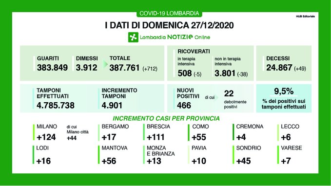 Pochissimi tamponi effettuati oggi in Lombardia: solo 4901, con 466 positivi (il 9,5%). In provincia di Cremona sono 4 i nuovi casi rilevati, il numero più basso di tutta la Regione. In Lombardia continuano a diminuire i ricoverati in terapia intensiva (-5) e nei reparti (-38), sono ancora 49 le persone decedute.