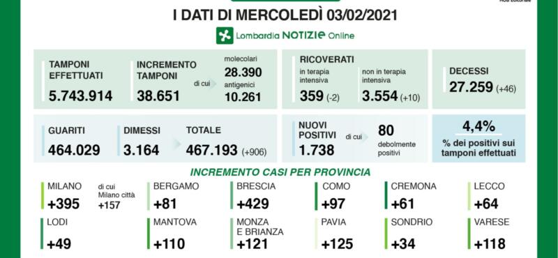 Per quanto riguarda le altre province: Milano registra 395 contagi, di cui 157 in città, Bergamo 81, Brescia 429, Como 97, Lecco 64, Lodi 49, Mantova 110, Monza e Brianza 121, Pavia 125, Sondrio 34 e Varese con 118. I guariti/dimessi sono 906.
