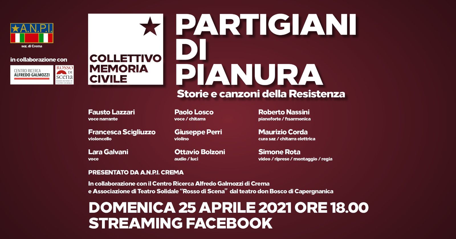 L’evento è nato da un’idea del collettivo Memoria Civile, in collaborazione con Anpi Crema, Centro Galmozzi e Rosso di Sera. Verrà trasmesso in streaming, domenica, sui canali social dei circoli provinciali dell’Arci.