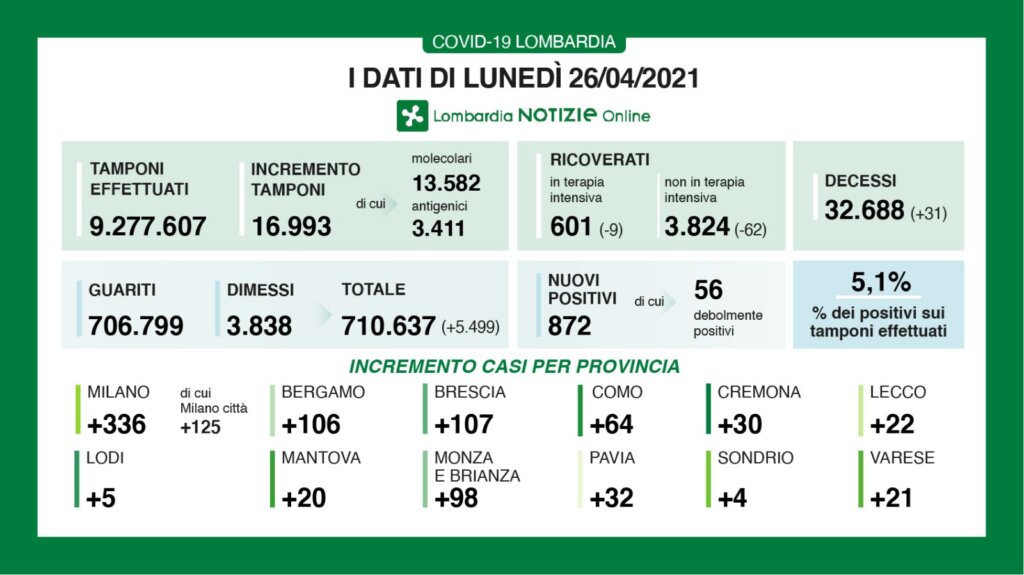 ono 30 i nuovi contagi da Covid in provincia di Cremona per un numero regionale di tamponi di 16.993. I nuovi positivi in Lombardia sono 872, di cui 56 ‘debolmente positivi’. L’indice di contagio è al 5,1%.