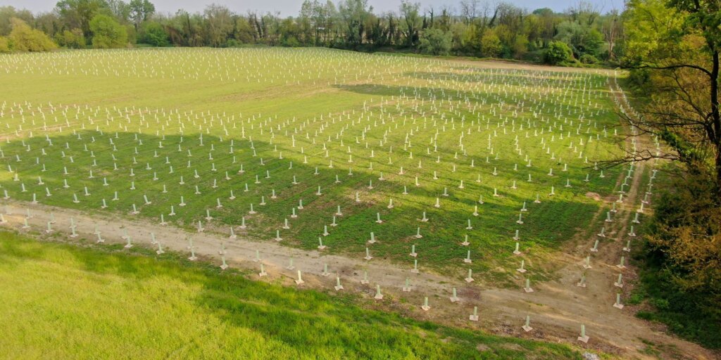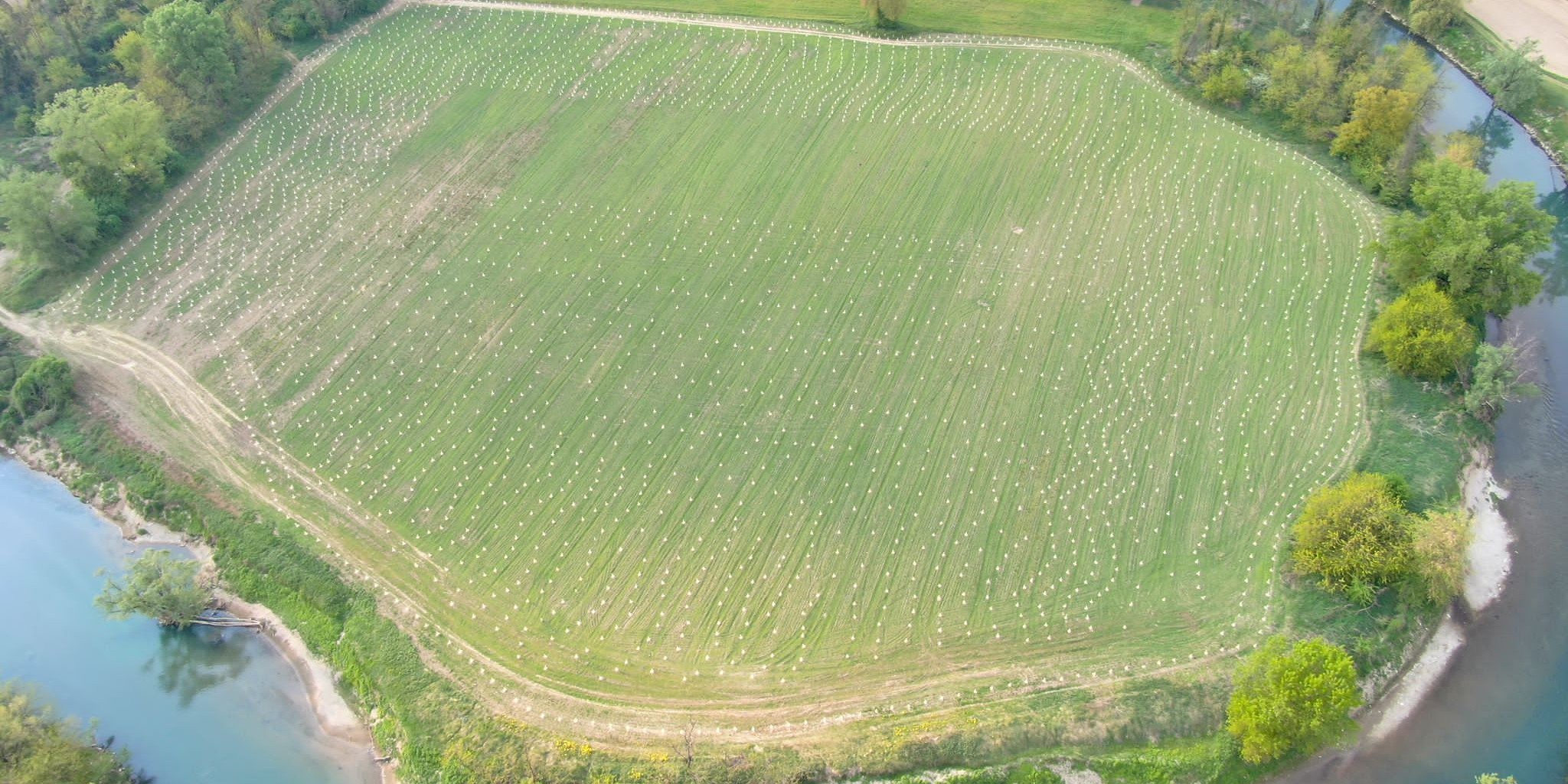 Nei mesi scorsi avevamo scritto del progetto ‘Meandro Verde’, che arricchirà il territorio cremasco di 5 mila alberi, nell’ambito di “Arco Blu – ricostruzione del Capitale Naturale nella bassa pianura bergamasca e nell’alto cremasco”, che vede la partecipazione di diversi soggetti, con il Parco del Serio capofila: Università di Bergamo, Legambiente Lombardia, Parco Oglio Nord, Consorzio DUNAS, diversi comuni, a cui va aggiunto il sostegno di Fondazione Cariplo e Regione Lombardia. Terminate le opere preliminari e propedeutiche, i tracciamenti e le piantumazioni, come si può notare dall’immagine aerea, comincia a prendere forma il progetto, nell’area agricola incolta in un’ansa del fiume Serio, al confine tra il territorio di Crema e quello di Pianengo, che il Parco aveva acquisito dal Consorzio Agrario di Cremona.