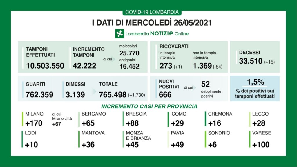 Sono 16 i nuovi casi di coronavirus in provincia di Cremona. 666 – di cui 52 debolmente positivi – in Lombardia, a fronte di 42.222 tampone (dei quali 16452 antigenici). L’indice di contagio nella regione del 1,5%.