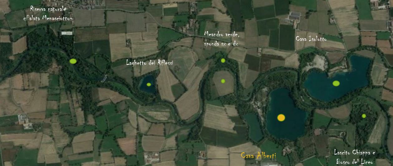 Un’area molto vasta, di circa 40 ettari (o 600 pertiche, come ama dire il presidente Monaci), al cui interno vi sono 2 laghetti frutto dell’attività di escavazione portata avanti negli anni, che raggiungono profondità di circa venti metri e che costituiscono più della metà dell’intera area, ma anche fabbricati e attrezzature, ormai abbandonati dopo il fallimento dell’ex cava Alberti e proprio per questo, alla mercè di vandalismi negli ultimi anni.