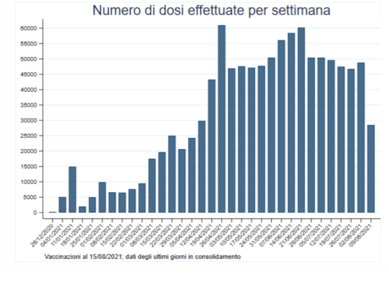 Venendo all’andamento delle vaccinazioni, si nota come sono drasticamente scese nella seconda settimana di agosto: dopo il picco assoluto di oltre 60mila dosi del 26 aprile, da luglio il numero è sempre stato di poco sotto le 50mila dosi, per precipitare poi a meno di 30mila dal 9 agosto. gbiagi
