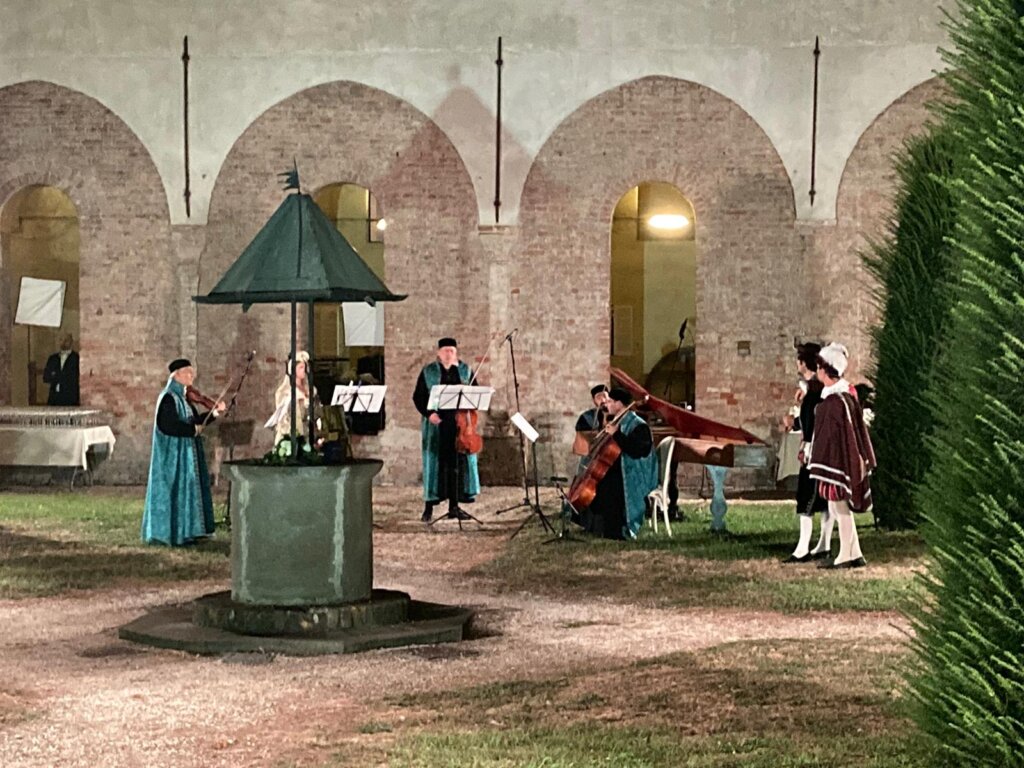 Dame in abiti d’epoca, musica, luci e soprattutto profumi e sapori. Questi gli ingredienti principali della serata di mercoledì 1 settembre all’interno dell’affascinante cornice dei Chiostri del Museo Civico di Crema e del Cremasco. Una serata evento che ha visto protagonista Venezia, la sua storia, le sue tradizioni, i suoi viaggi e i suoi colori attraverso la collaborazione tra I Mondi di Carta di Crema e l’Atelier Pietro Longhi di Venezia. La socia de I Mondi di Carta Monica Caio ha intessuto nei dettagli la serata che, grazie alla magistrale regia di Raffaele Dessì, ha saputo raccontare una storia d’amore che ha coinvolto gli oltre cento ospiti raccolti attorno al chiostro del Museo.