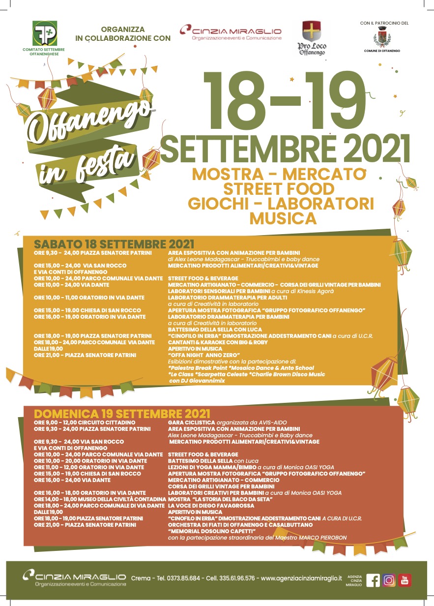 Il 18 e 19 Settembre si svolgerà “Offanengo in festa”, organizzato dal Comitato Settembre offanenghese in collaborazione con l’agenzia Cinzia Miraglio e la Proloco del paese.