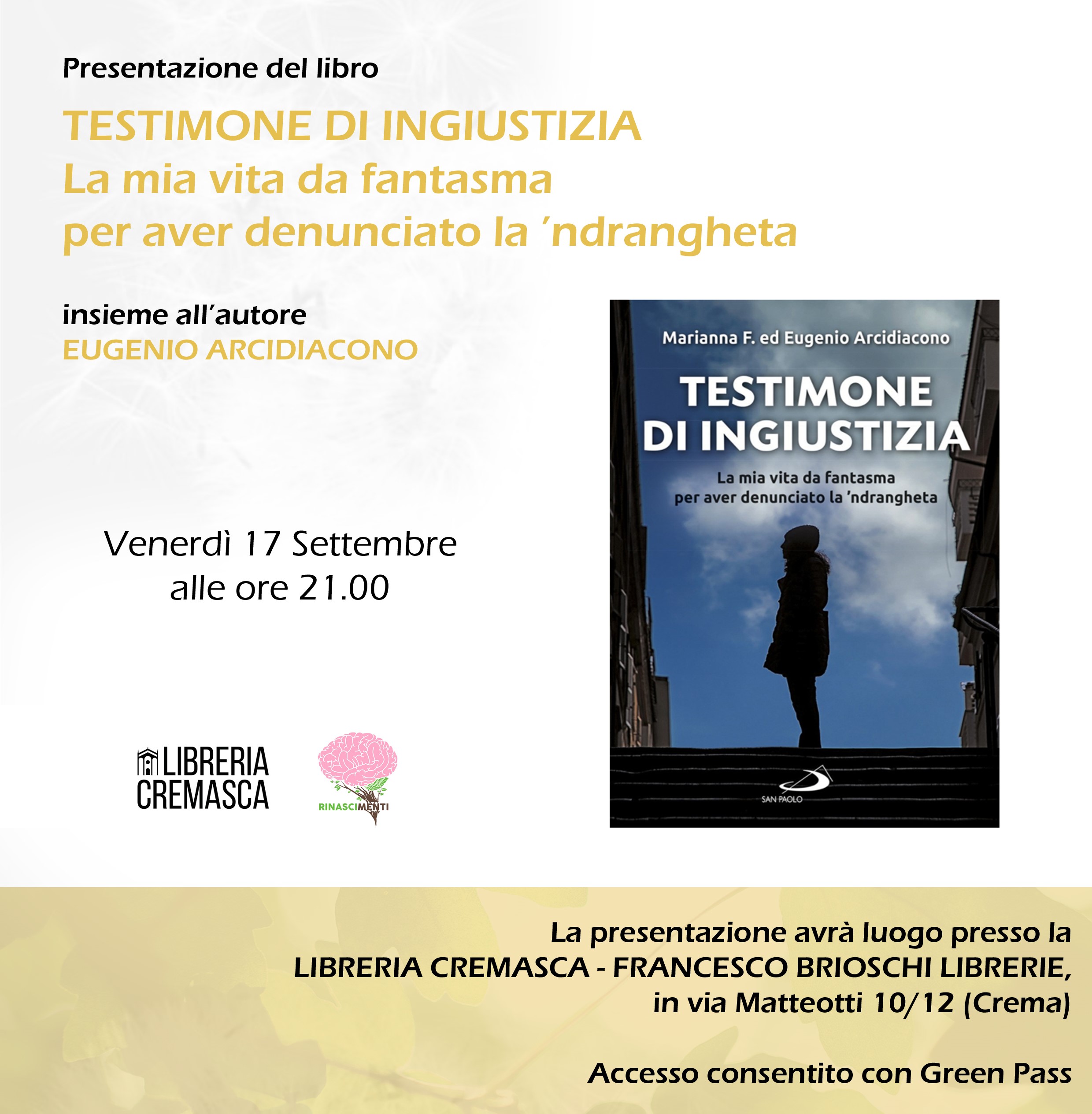 Venerdì 17 settembre alle ore 21 presso la Libreria Cremasca, l’associazione RinasciMenti avrà il piacere di ospitare Eugenio Arcidiacono, autore del libro “Testimone di Ingiustizia”, pubblicato da Edizioni San Paolo. Il libro racconta di una donna calabrese che decide di denunciare i killer dell’ndrangheta che hanno ucciso i suoi due fratelli.