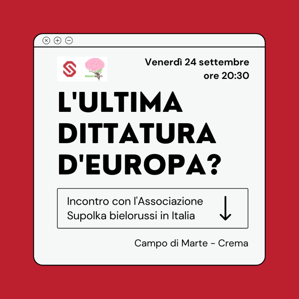 Venerdì 24 settembre alle ore 20.30 presso il Campo di Marte di Crema, l’associazione RinasciMenti ospiterà per una serata di discussione, l’Associazione Bielorussi in Italia “Supolka” per parlare della difficile situazione politica della Bielorussia, raccontata dal punto di vista di chi ci vive, ci ha vissuto o di chi ha ancora parenti che vivono nel paese. In seguito alle elezioni dell’agosto 2020 sono scoppiate violente proteste contro il presidente Alexander Lukashenko ed il suo governo, queste si sono prolungate fino ad oggi, riaccendendo le tensioni tra Unione Europea, Bielorussia e Russia. Non sarà una conferenza, ma un racconto, con testimonianze video e canzoni per raccontare la storia di un paese e del suo popolo, in un momento storico particolarmente difficile.