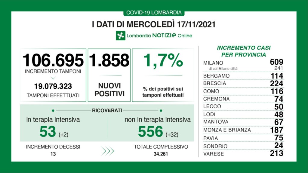 Aumentano di giorno in giorno i casi di Covid in provincia di Cremona. Nelle ultime 24 ore si sono registrati 74 nuovi positivi. In regione, a fronte di 106.695 tamponi effettuati, sono 1.858 i nuovi casi (1,7%). In aumento i ricoveri, sia nei reparti di terapia intensiva che in quelli ordinari. 13 i morti.