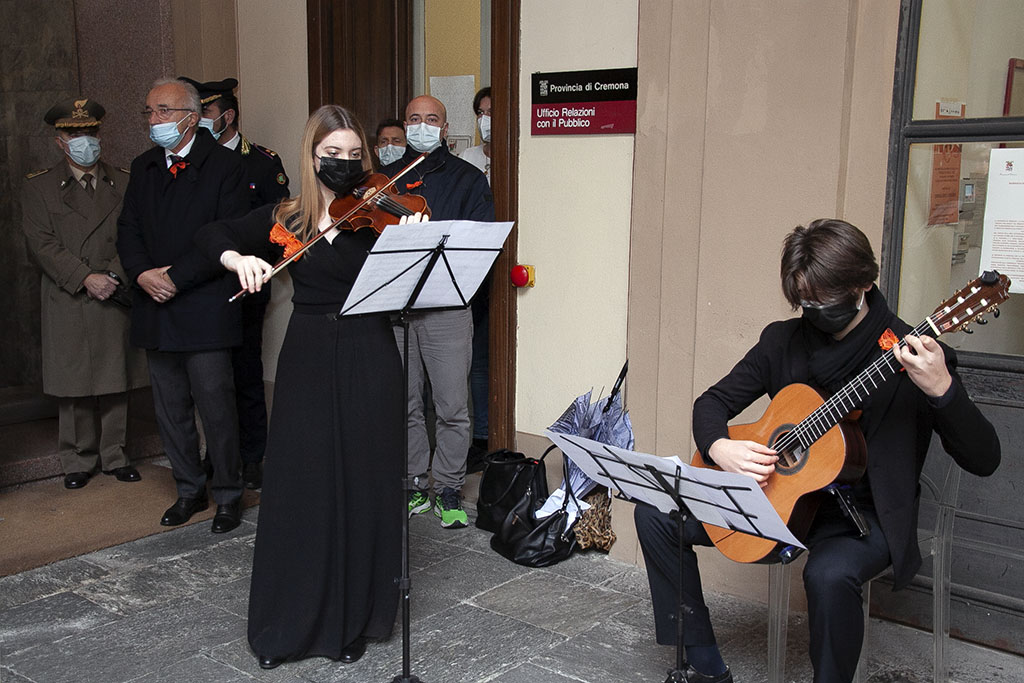 Toccante l’esibizione musicale con brani di N. Paganini e C. Saint-Saëns, eseguiti dagli allievi dell’Istituto Musicale Stradivari di Cremona Alice Patrushev, violino e Giuseppe Contartese, chitarra, accompagnati dalla prof.ssa Eleonora Pasquali, docente di chitarra dell’Istituto Musicale Stradivari di Cremona.