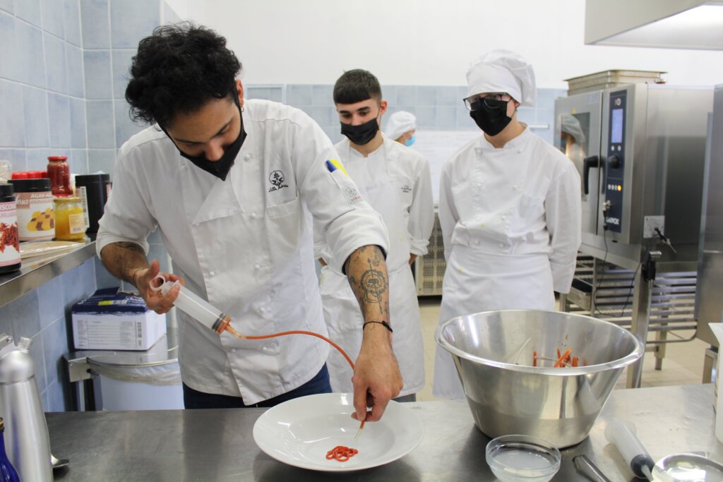 Cucinare ma in maniera diversa rispetto al solito, avvicinando gli allievi verso le nuove tendenze: questo uno degli obiettivi del ciclo di lezioni sulla cucina molecolare, che sta interessando una classe terza dell’indirizzo cucina presso il laboratorio di via Dogali. A guidare i ragazzi, chef Gian Luca Mauri e Andrea Tammaccaro, specializzatosi nel settore dopo aver conseguito la maturità proprio allo Sraffa: “L’obiettivo è quello di stimolare i ragazzi verso la sperimentazione di nuovi piatti e allo stesso tempo essere all’avanguardia attraverso l’aggiornamento continuo – dice il prof. Ferdinando Sapienza, docente della classe 3 A PNU – e questo vale sia per gli alunni, che per noi docenti”.