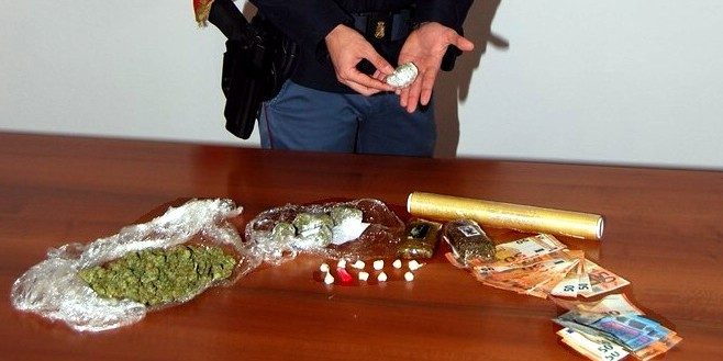 Nel suo zaino sono state trovate diverse dosi di cocaina ed ecstasy. Successivamente gli agenti hanno perqusito la sua abitazione, rinvendovi 1 etto di marijuana, 2,5 etti di hashish, 15 grammi di cocaina, 15 grammi di ecstasy e 15 grammi di wax.