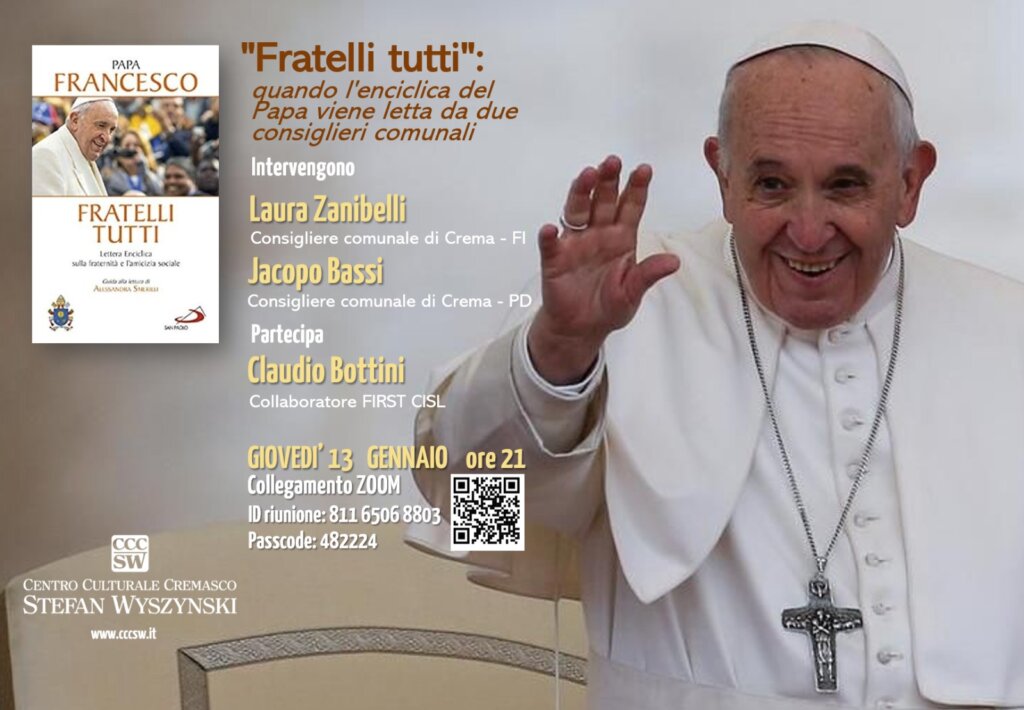 Giovedì prossimo, 13 gennaio alle ore 21.00, il Centro culturale ha organizzato un incontro pubblico in cui avremo modo di interloquire con i due consiglieri, ponendo loro domande per approfondire le tematiche dell’enciclica nella chiave di lettura della costruzione del bene comune a partire da posizioni diverse.