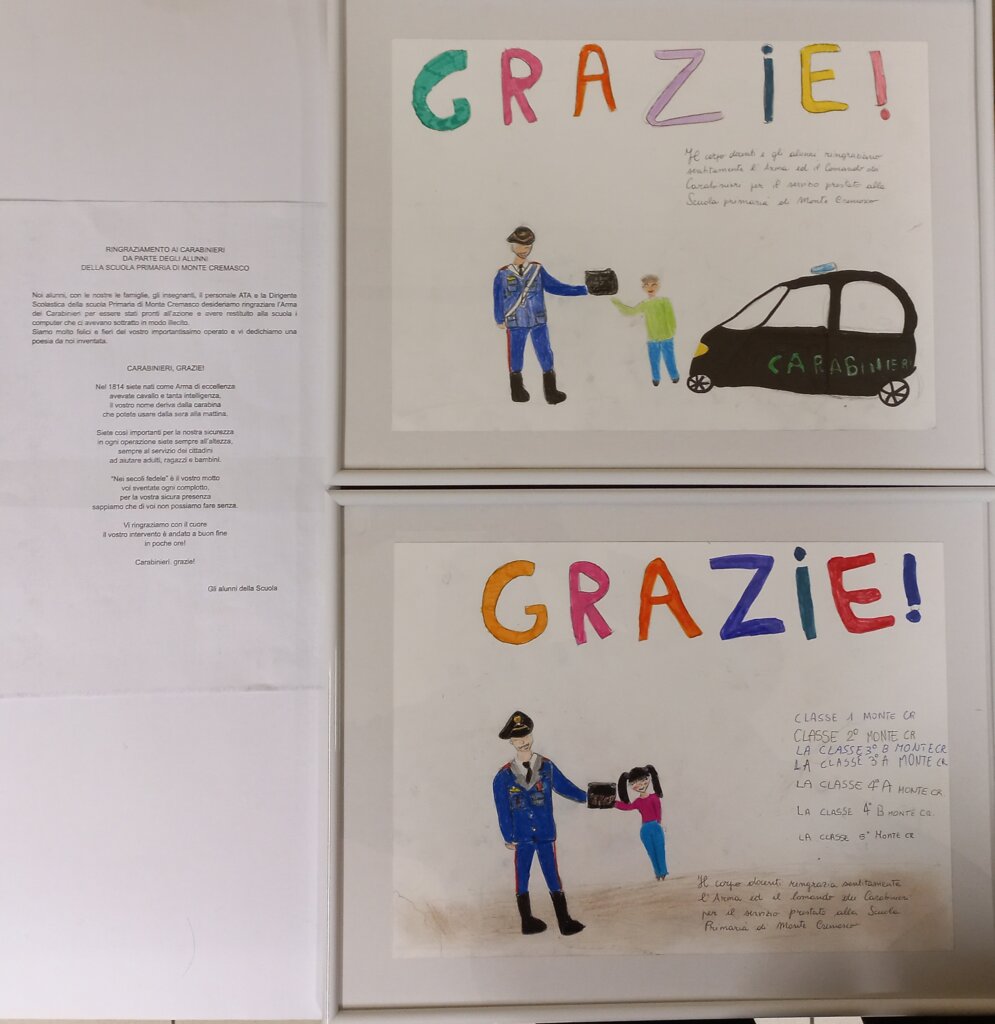 I bambini delle scuole elementare e media di Monte Cremasco hanno ringraziato i Carabinieri della Compagnia di Crema per essere riusciti a sventare, nella notte dell’8 febbraio, il furto di tablet e computer portatili dalla loro scuola, materiale utilizzato nelle aule e nei laboratori. La notte del furto i Carabinieri avevano intercettato nei pressi della scuola una Panda, poi risultata rubata, il cui conducente alla vista dei militari era scappato per alcuni chilometri. Quando aveva capito di non poter fuggire, il ladro aveva imboccato una strada di campagna e si era lanciato dall’auto in corsa, scappando per i campi con il favore del buio. Sull’auto erano stati trovato 10 personal computer, mentre all’interno della scuola erano poi stati ritrovati altri 11 tablet e PC che mancavano dalle aule e che erano dentro un sacco lasciato vicino all’ingresso e pronto per essere portato all’esterno.