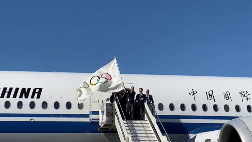 La bandiera olimpica consegnata ai sindaci di Milano e Cortina nel corso della cerimonia di chiusura delle Olimpiadi invernali di Pechino, è arrivata a Milano Malpensa.