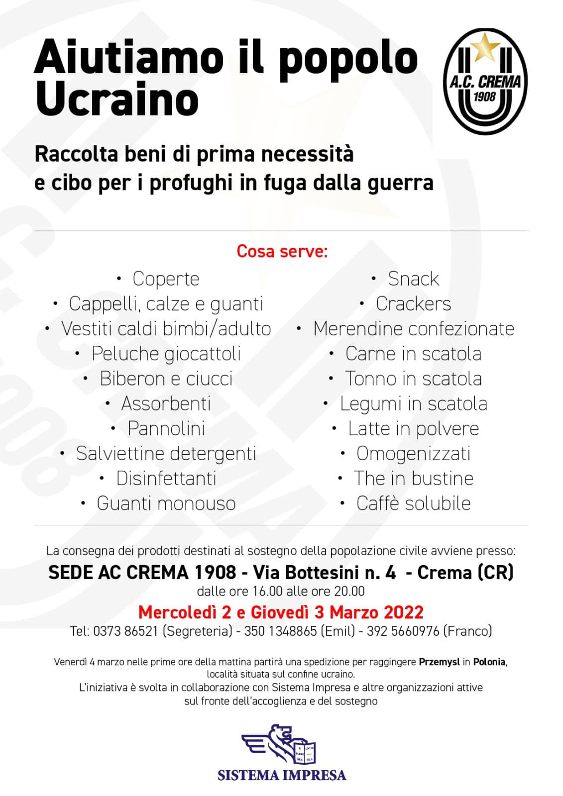 L’AC Crema 1908 sostiene il popolo ucraino inviando cibo e generi di prima necessità ai profughi in fuga dalla guerra. Oggi, mercoledì 2 marzo, e domani, dalle 16 alle 20, nella sede di via Bottesini si raccoglieranno prodotti alimentari, vestiti, articoli sanitari e per l’infanzia che saranno consegnati alla popolazione ucraina. I furgoni partiranno nella mattinata di venerdì.