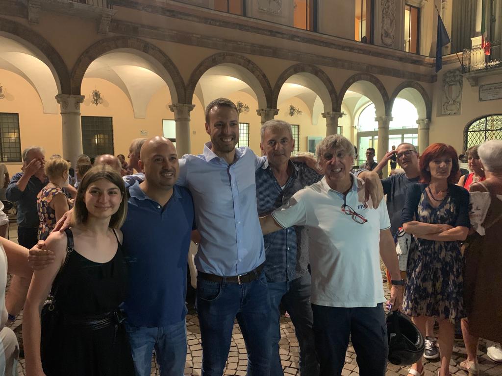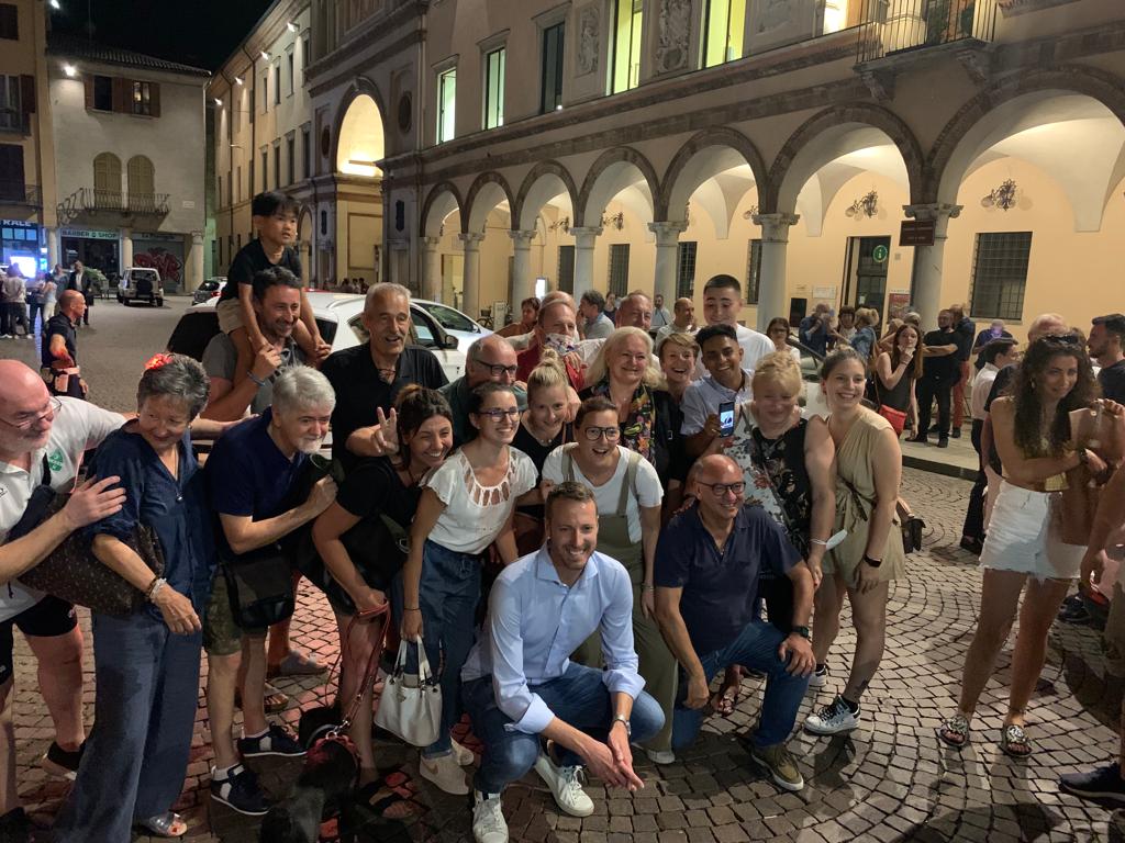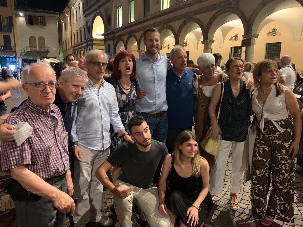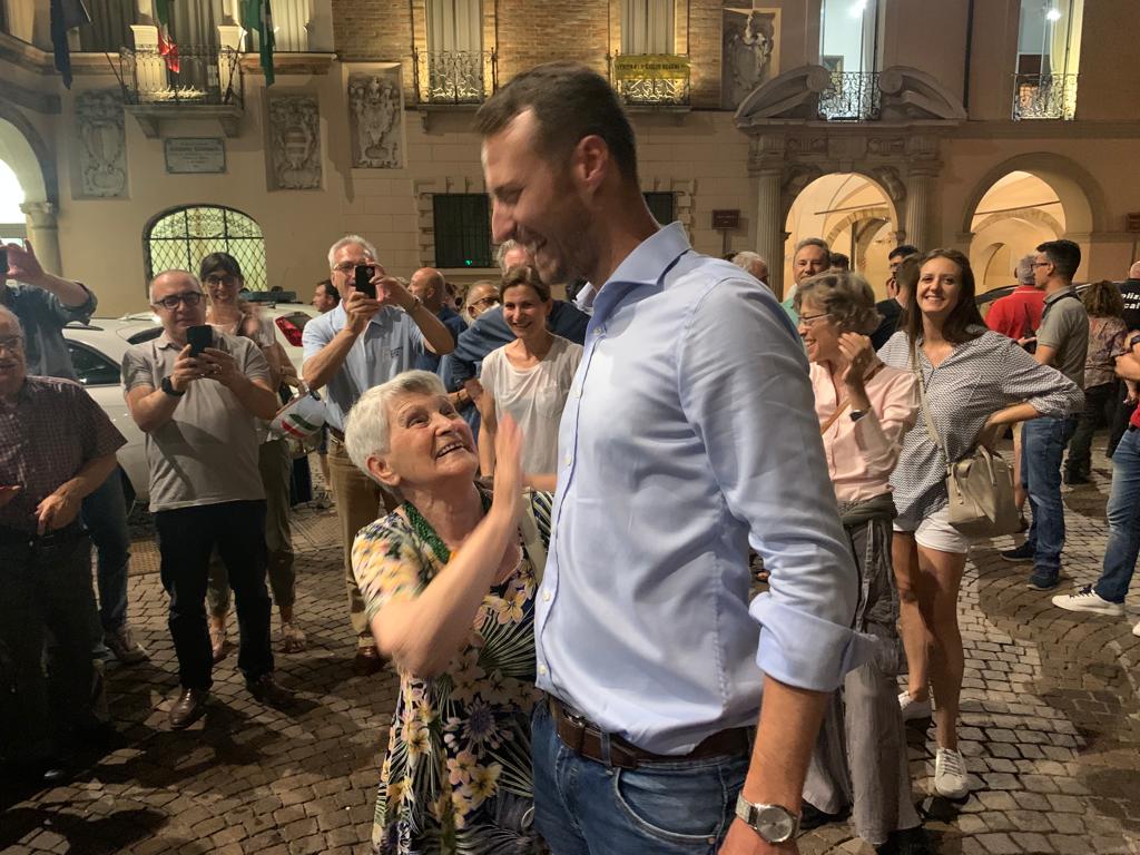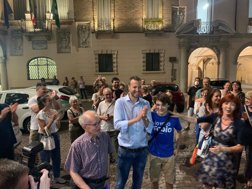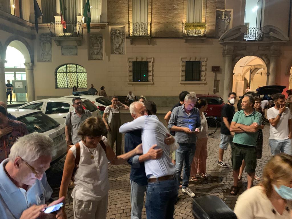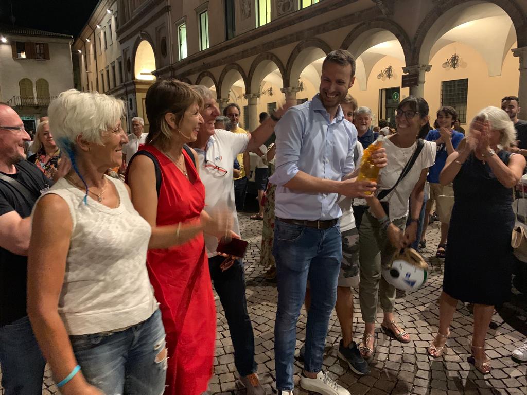 Oltre ai membri delle liste che sostenevano Fabio Bergamaschi, sono accorse in centro anche tante persone che ci tenevano a congratularsi con il nuovo sindaco per la vittoria.