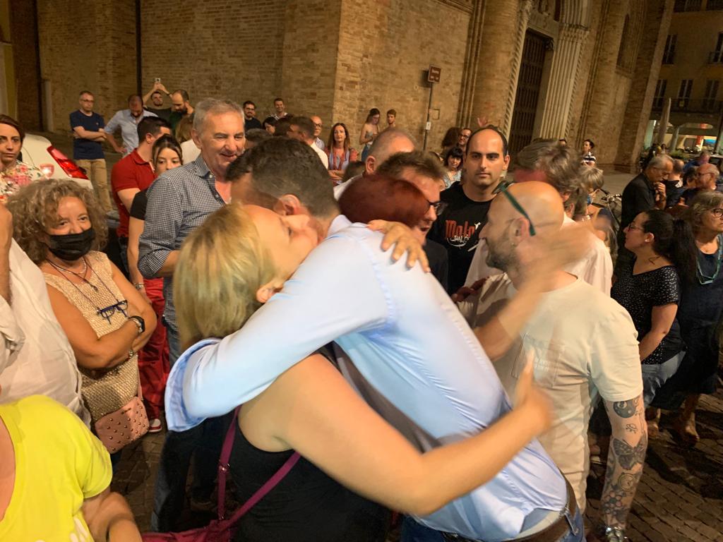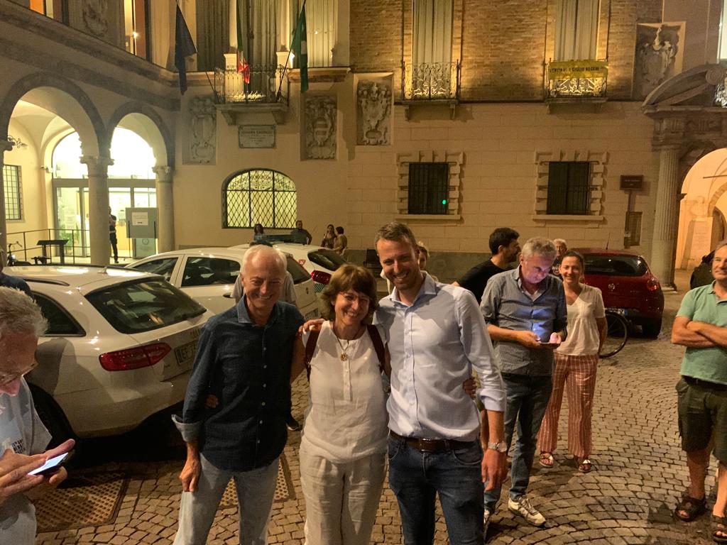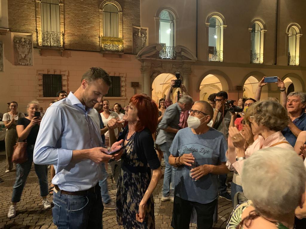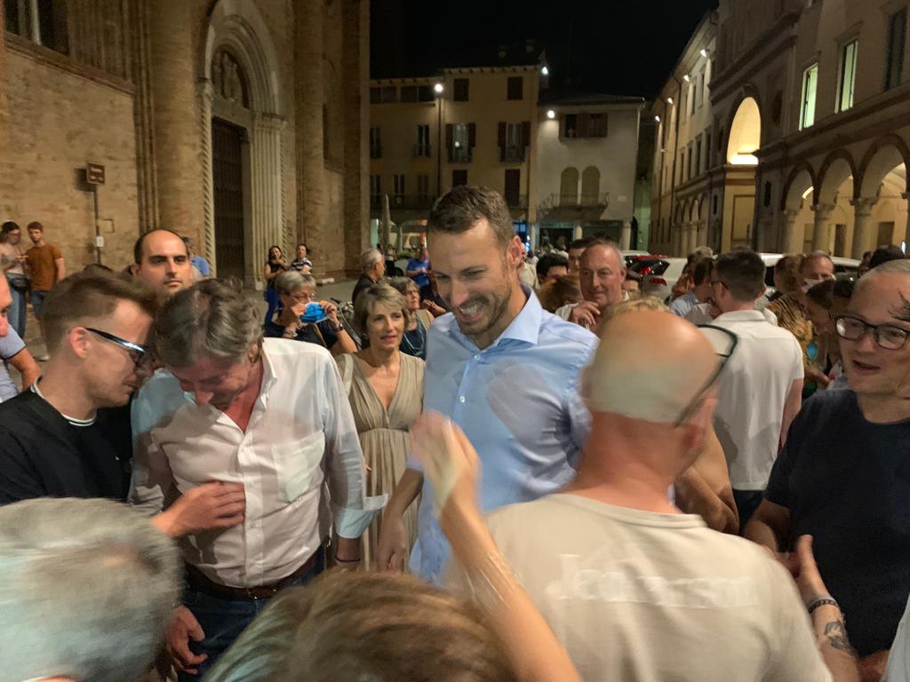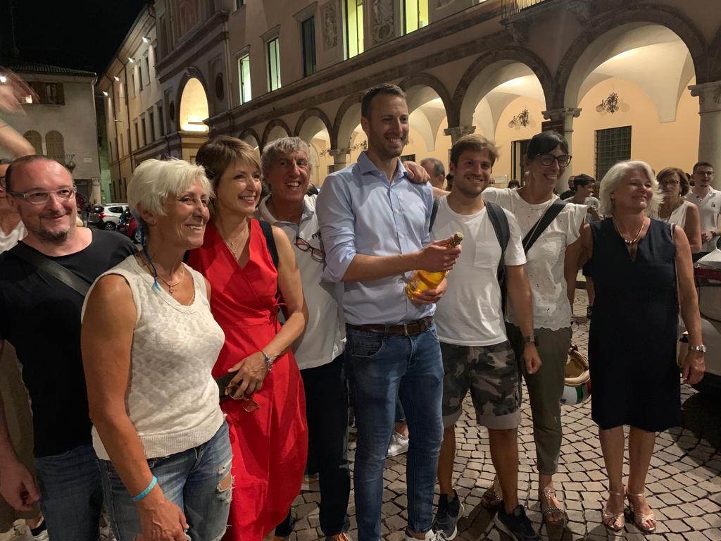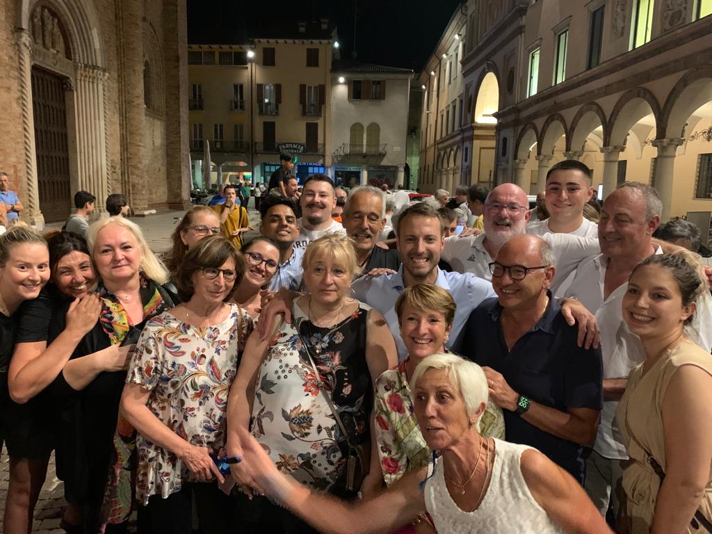 Oltre ai membri delle liste che sostenevano Fabio Bergamaschi, sono accorse in centro anche tante persone che ci tenevano a congratularsi con il nuovo sindaco per la vittoria.