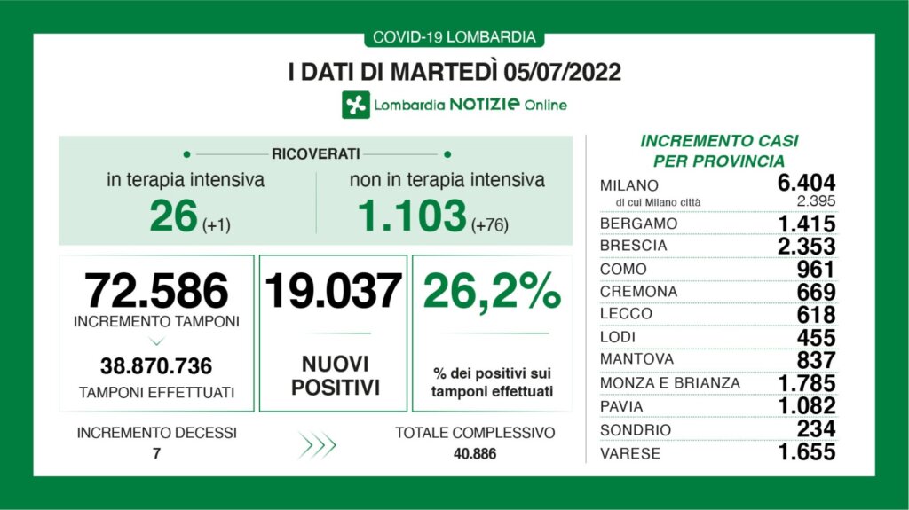 – i tamponi effettuati: 72.586, totale complessivo: 38.870.736– i nuovi casi positivi: 19.037– in terapia intensiva: 26 (+1)– i ricoverati non in terapia intensiva: 1.103 (+76)– i decessi, totale complessivo: 40.886 (+7)