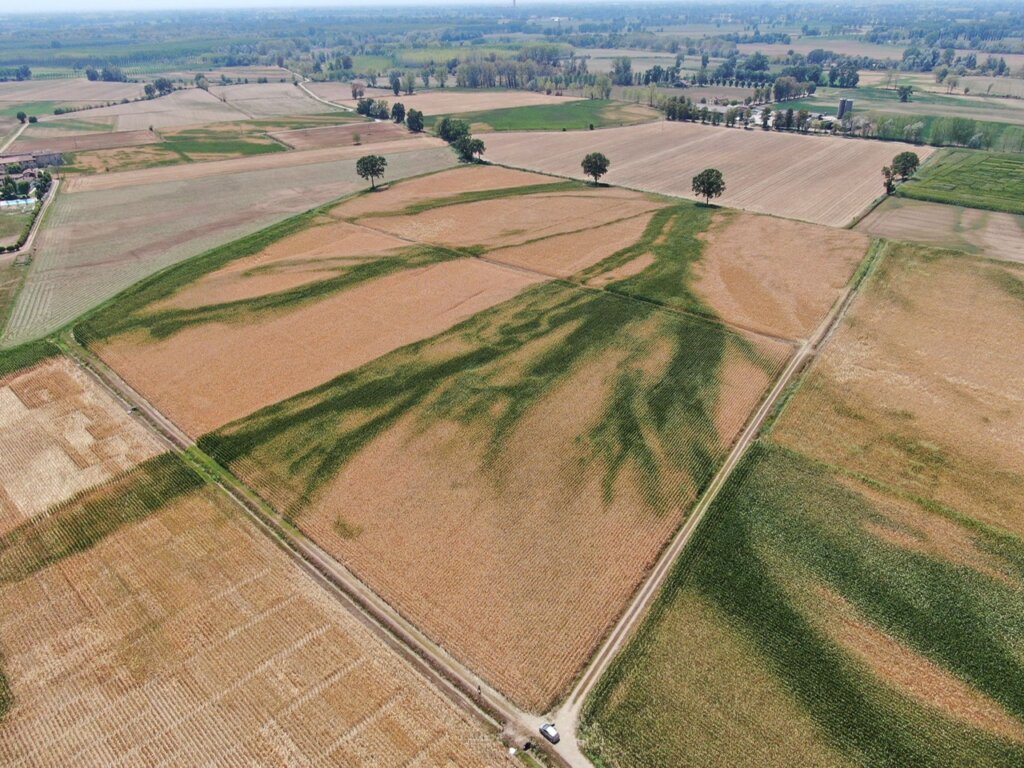 Le foto aeree richiamano i colori di paesaggi “desertici”, mostrano campi di mais arsi dal sole e prati stabili ormai inesistenti, in un periodo dell’anno in cui, al contrario, la campagna della pianura padana vista dall’alto dovrebbe apparire verde e rigogliosa.