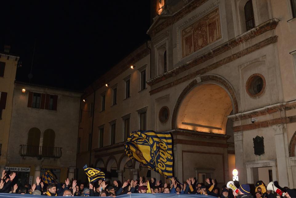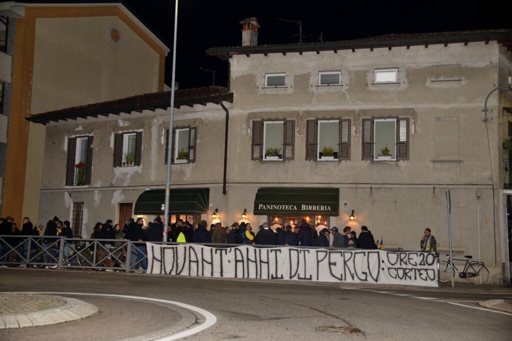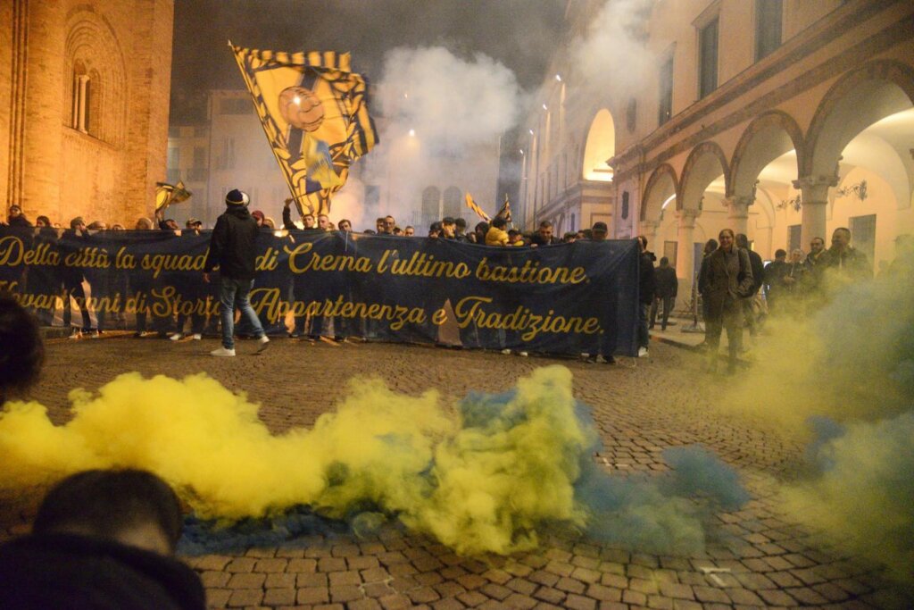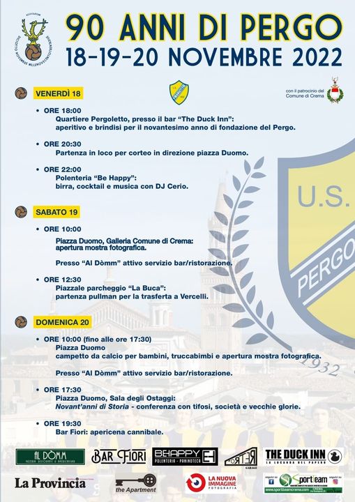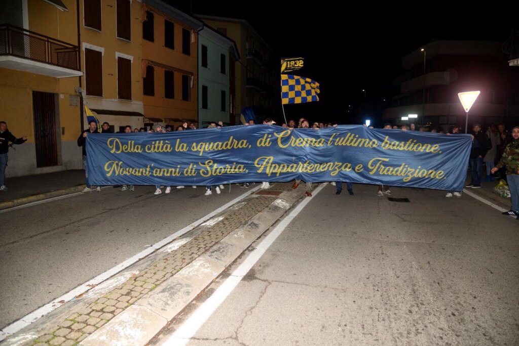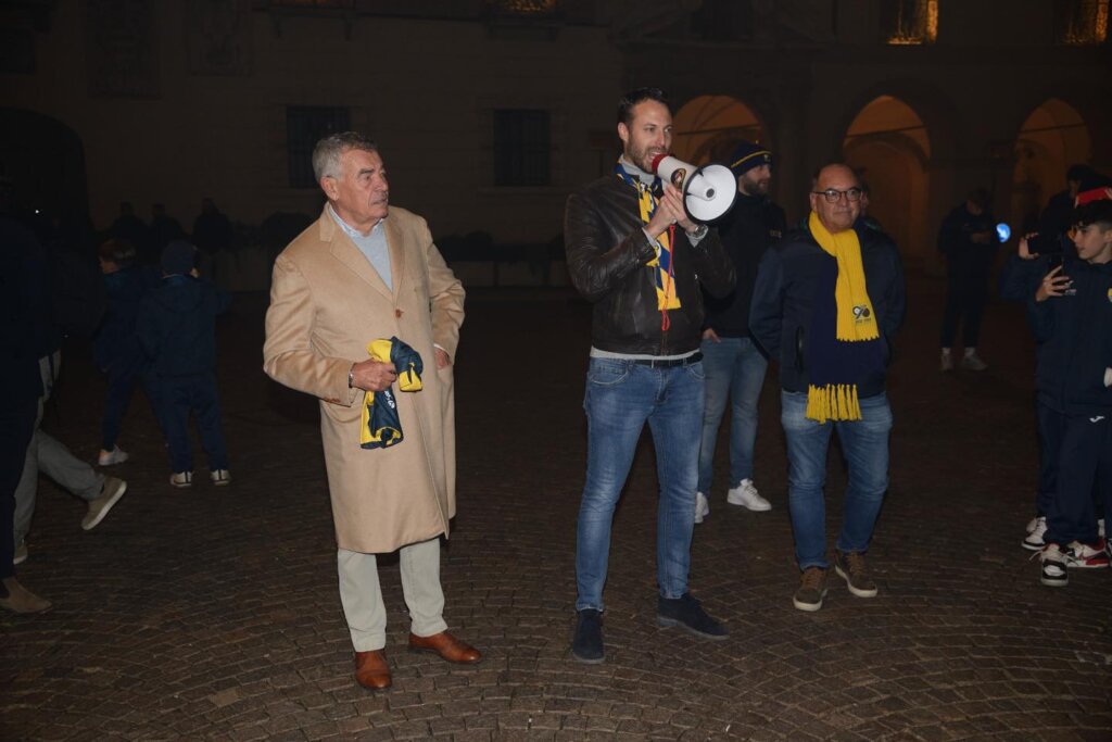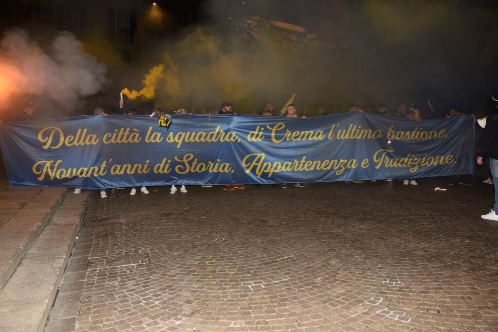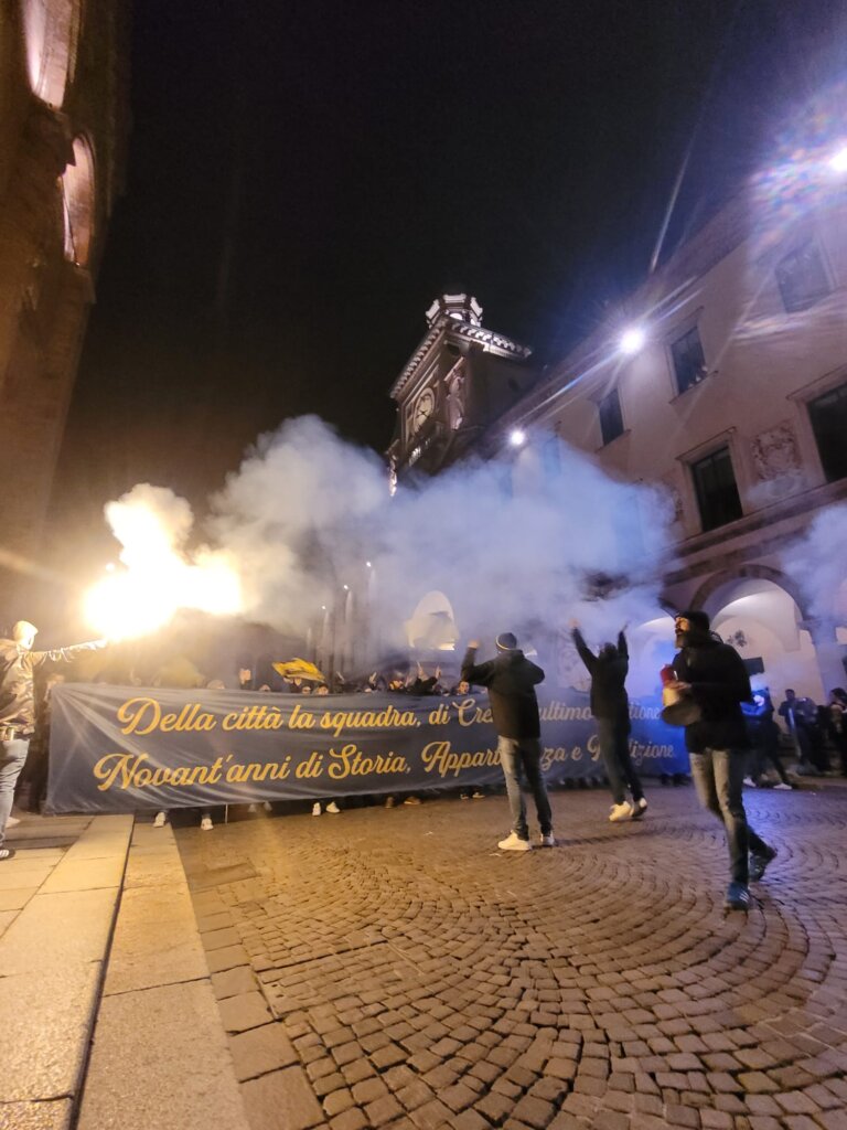 Le tre giornate di festa per l’anniversario di fondazione della Pergolettese, che in questo 2022 compie 90 anni, hanno avuto inizio ieri sera, venerdì 18 novembre, con un corteo dei tifosi che dal bar del quartiere del Pergoletto, dove è stata fondata la società, ha raggiunto piazza Duomo per “simboleggiare la crescita della società, da squadra di quartiere a più importante realtà calcistica della città”, come si legge in una nota del club. Qui il dg gialloblù Cesare Fogliazza ha donato al sindaco di Crema, Fabio Bergamaschi, e a un rappresentate dei tifosi la maglia celebrativa del novantesimo appositamente creata e che sarà utilizzata oggi nella trasferta di Vercelli e settimana prossima al Voltini contro la Virtus Verona.