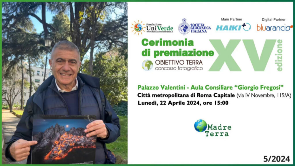 ROMA (ITALPRESS) – Cerimonia di premiazione del concorso fotografico “Obiettivo Terra” 2024 promosso da Fondazione UniVerde e Società Geografica Italiana, con la main partnership di Haiki+ e Bluarancio digital partner: lunedì 22 aprile, 15:00, Aula Consiliare “Giorgio Fregosi” di Palazzo Valentini (via IV Novembre, 119/A), sede della Città metropolitana di Roma Capitale, in occasione delle celebrazioni per la 55a Giornata Mondiale della Madre Terra, in diretta streaming sulla pagina Facebook @FondazioneUniVerde.