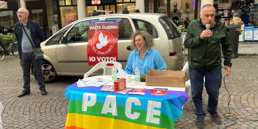 Un banchetto, le bandiere del Partito Rifondazione Comunista, insieme a quelle della Palestina e della pace. Così la Sinistra Europea di Michele Santoro ha presentato in Piazza Duomo a Crema l’euro candidata di Pace, Terra e Dignità, Anna Camposampiero, assistita da Beppe Bettenzoli.