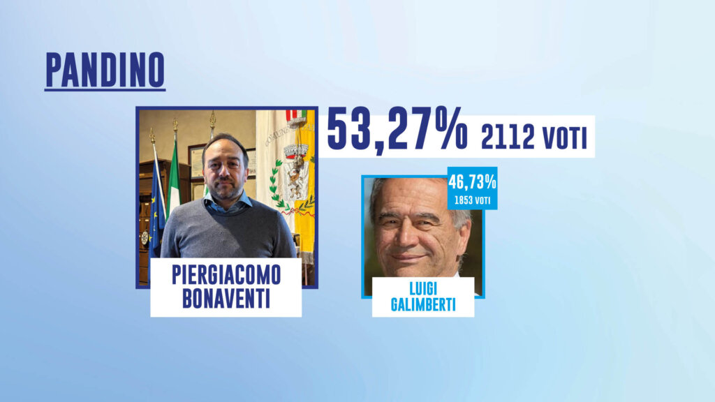 Una sfida tirata, grazie a due campagne elettorali ben svolte, che ha portato Piergiacomo Bonaventi ad essere nuovamente rieletto come sindaco di Pandino, ai danni dello sfidante Luigi Galimberti. Con il 53,27% dei voti, infatti, il sindaco uscente è riuscito a spuntarla di pochissimo rispetto al candidato di “Uniamo Pandino”, che ha ottenuto il 46,73% dei voti. Discreta affluenza alle votazioni: hanno votato 4117 cittadini su 6835, ottenendo la percentuale definitiva del 60,23%.