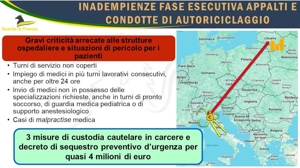 Qualora una delle imprese riconducibile agli indagati otteneva l’aggiudicazione del bando, in molti casi non erano in grado di garantire le prestazioni previste nel contratto, con il relativo danno alle strutture sanitarie, che si trovavano nelle condizioni di non poter operare, oppure impegavano i pochi medici disponibili in più turni lavorativi consecutivi, contrariamente alle disposizioni normative vigenti, o, ancora, inviavano medici non in possesso dei requisiti richiesti.