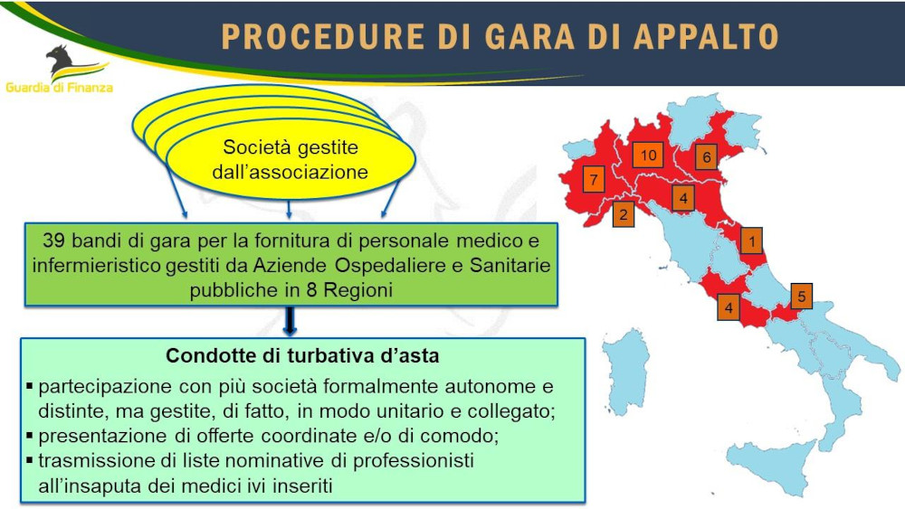 Le imprese nella disponibilità degli indagati venivano utilizzate per partecipare a bandi di gara per la fornitura di personale medico ed infermieristico a strutture ospedaliere ed aziende sanitarie pubbliche di varie regioni italiane (Emilia-Romagna, Piemonte, Lombardia, Veneto, Liguria, Marche, Lazio e Molise), presentando offerte coordinate nei loro contenuti in modo da assicurarsi la vittoria o, quantomeno, aumentarne le relative probabilità, falsando la concorrenza nelle procedure.