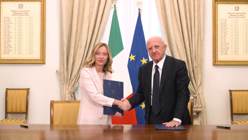 ROMA (ITALPRESS) – Il presidente del Consiglio dei ministri, Giorgia Meloni, ha sottoscritto a Palazzo Chigi l’Accordo per la coesione per la Campania con il presidente della Regione, Vincenzo De Luca. L’Accordo consente di assegnare alla Campania un ammontare di risorse nazionali, tra Fondo di Sviluppo e Coesione (FSC) 2021-2027 e Fondo di rotazione, pari a 3.478 milioni di euro per investimenti strategici per cittadini e imprese del territorio.