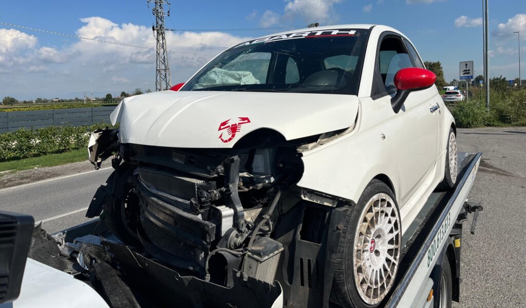 Il conducente della vettura coinvolta, una Fiat Abarth, ha perso improvvisamente il controllo, sbandando violentemente e terminando la sua corsa contro il muretto di un’azienda, sfondandolo letteralmente.