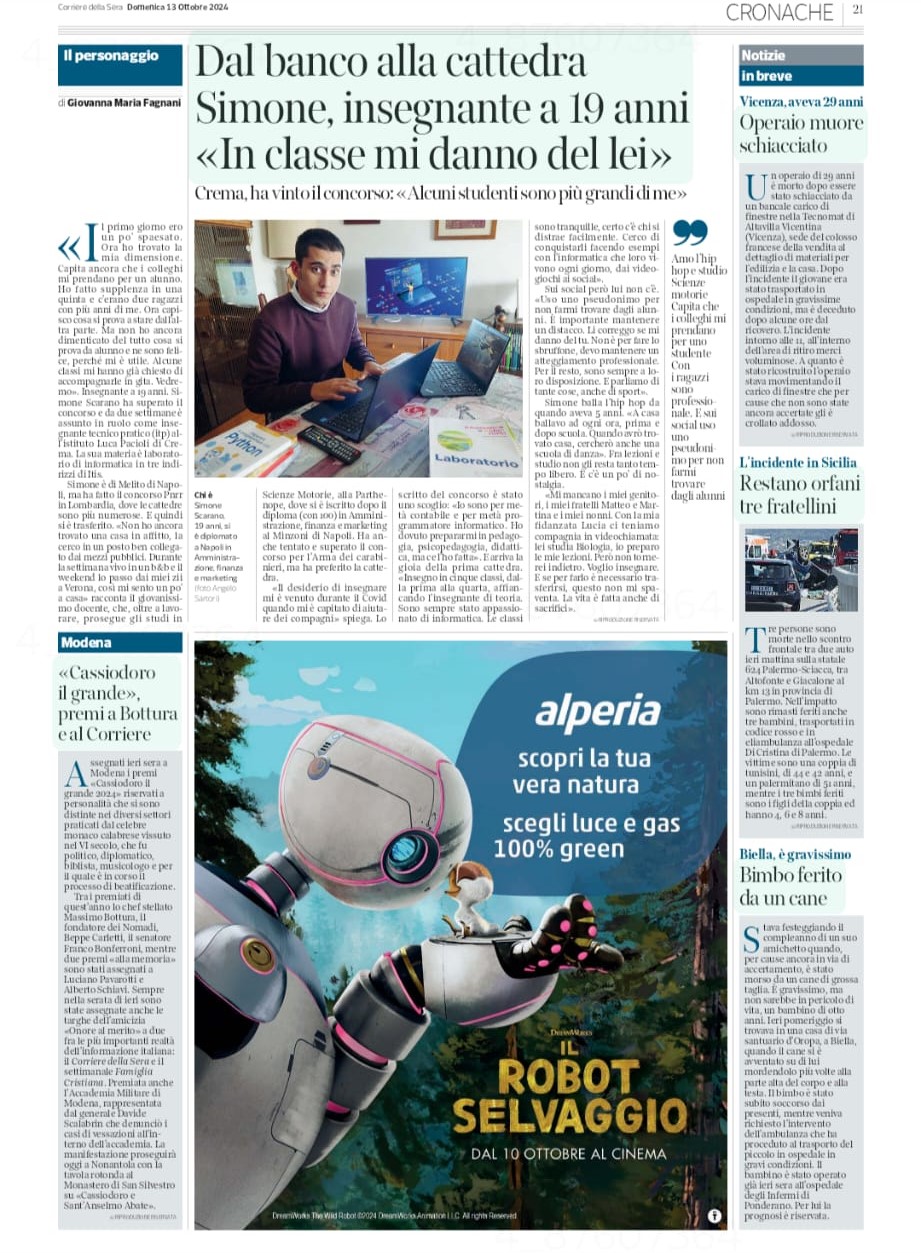 “Ho incontrato anche dei genitori nei consigli di classe – dice nell’intervista al Corriere della Sera – e naturalmente un po’ di stupore c’è per la mia età. Oggi insegno laboratorio in cinque classi, dalla prima alla quarta. I ragazzi hanno 3 ore la settimana e in due di queste affianco l’insegnante di teoria. Sono sempre stato appassionato di questa materia, adoro programmare, il linguaggio Pyton. Le classi sono tranquille, certo, mi accorgo che c’è qualcuno che si distrae più facilmente, ma cerco di rendere le lezioni più interessanti facendo esempi dell’informatica che loro vivono ogni giorno, dai videogiochi ai social. Prendo spunto dalle lezioni che ci faceva il nostro professore al Minzoni, Pasquale De Michele».