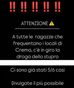 Sta circolando in queste ore, soprattutto nelle Instagram stories, l’avvertimento a prestare attenzione alla “droga dello stupro” in alcuni locali della movida cremasca. “A tutte le ragazze che frequentano i locali di Crema, c’è in giro la droga dello stupro. Ci sono già stati 5/6 casi. Divulgate il più possibile” recita la storia.