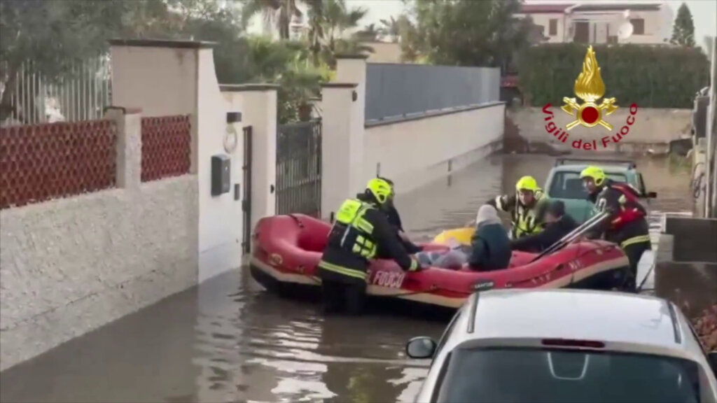 Maltempo nel messinese, i soccorsi in gommone dei Vigili del Fuoco